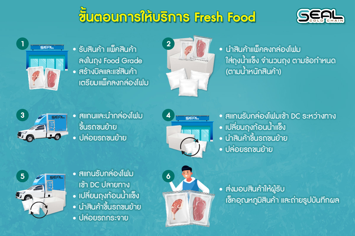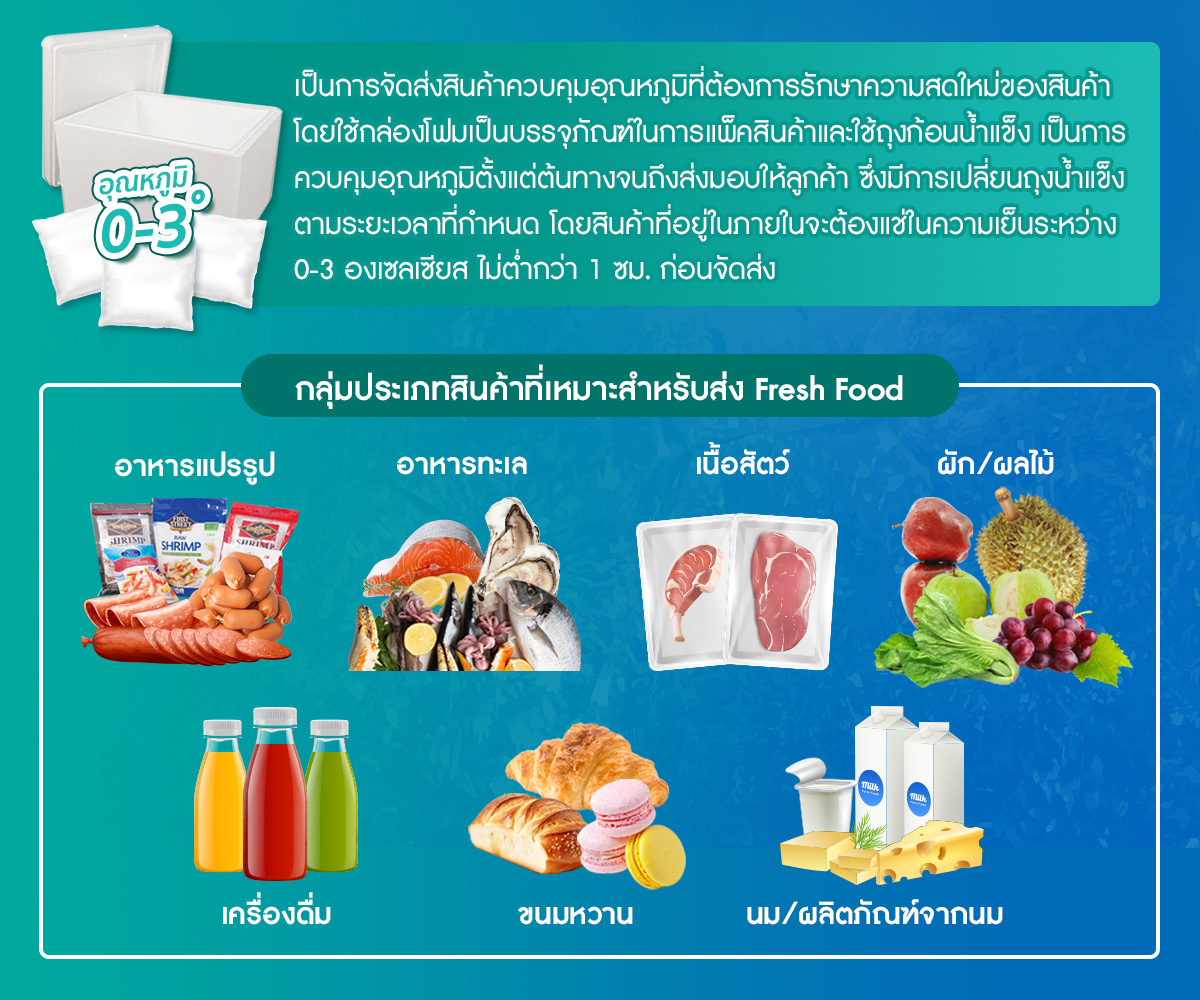 การส่งสินค้าคุมอุณหภูมิจากต้นทางจนถึงปลายทาง โดยลูกค้าจะเตรียมสินค้า วัสดุทำความเย็น และแพ็คสินค้าลงในกล่องโฟมด้วยอุปกรณ์ของลูกค้าเอง